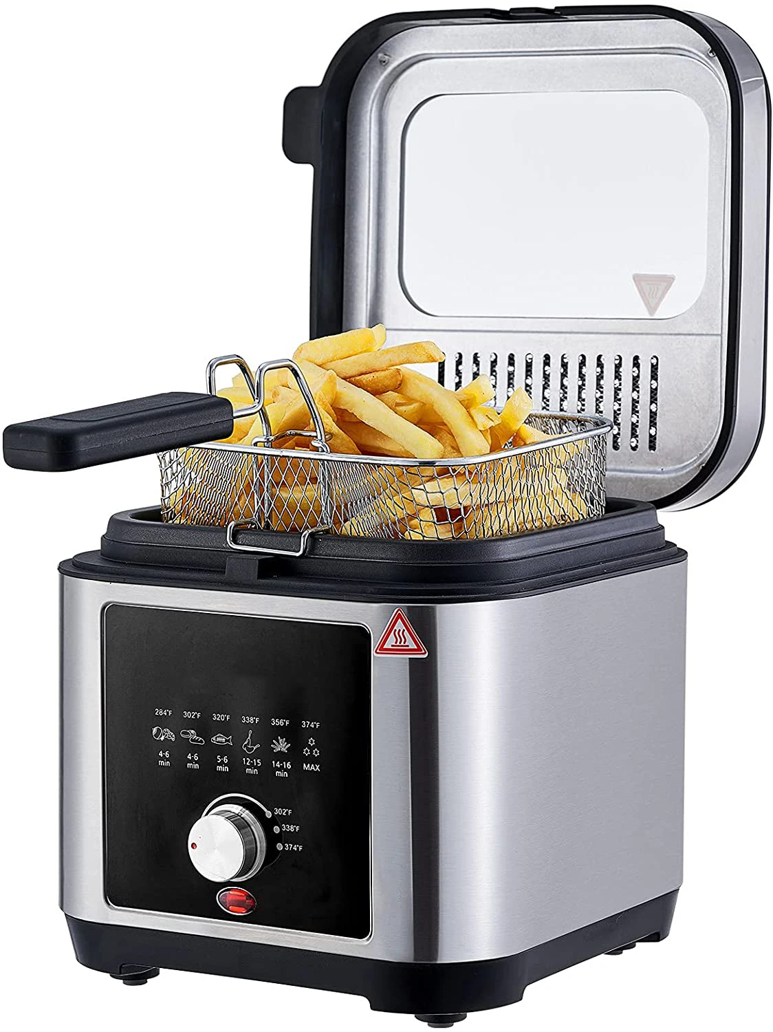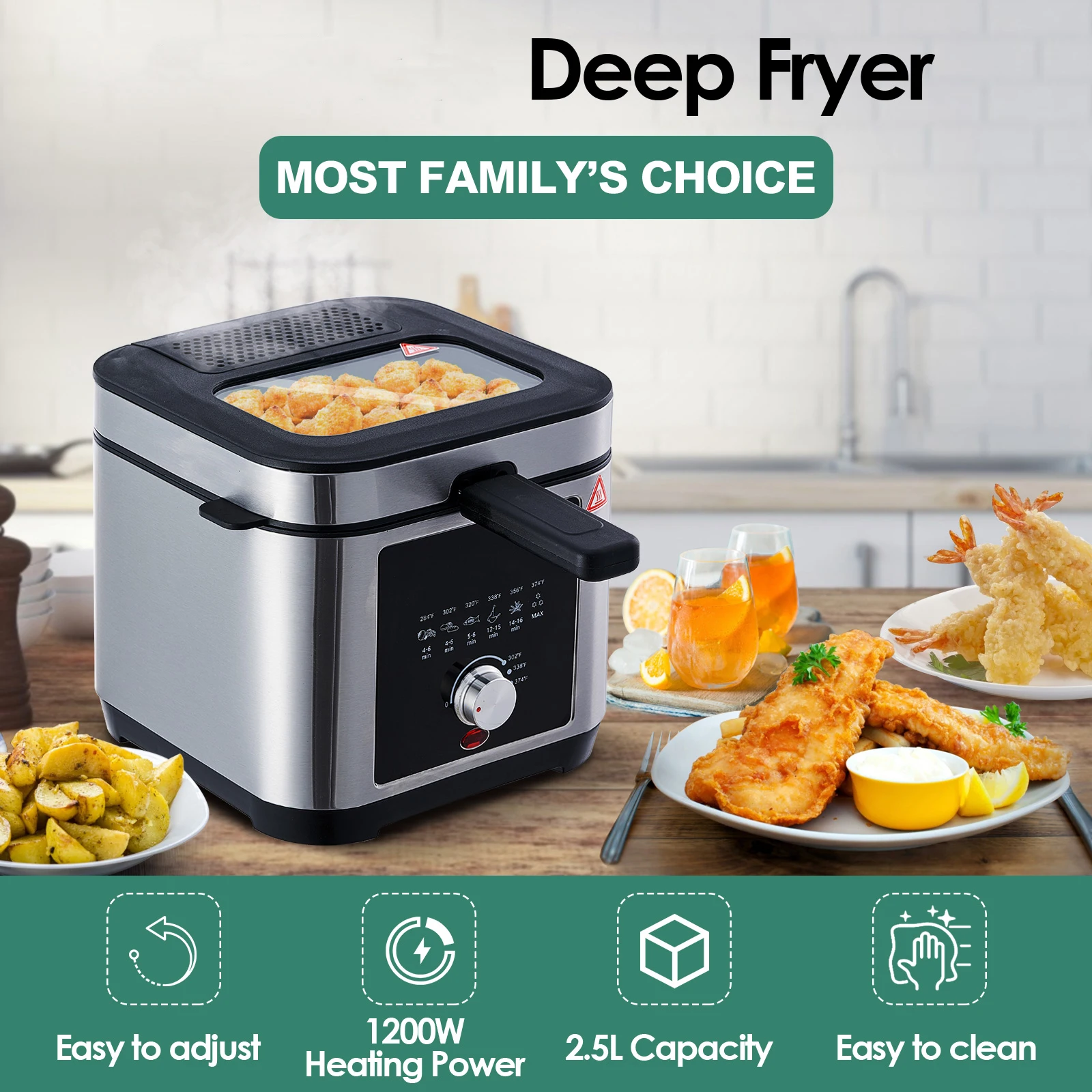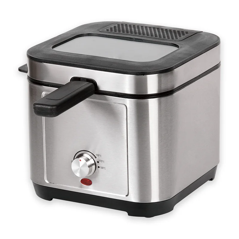 220-240V, 50/60Hz, 1200W Capacity: 2.5L Brushed S/S housing Variable temperature: 150-190℃ Temperature control by thermostatRemovable lid with large window and filter Non stick coated, fixed oil tank with non sitck coating Cool-touch handle Indicatorlight Overheat protection